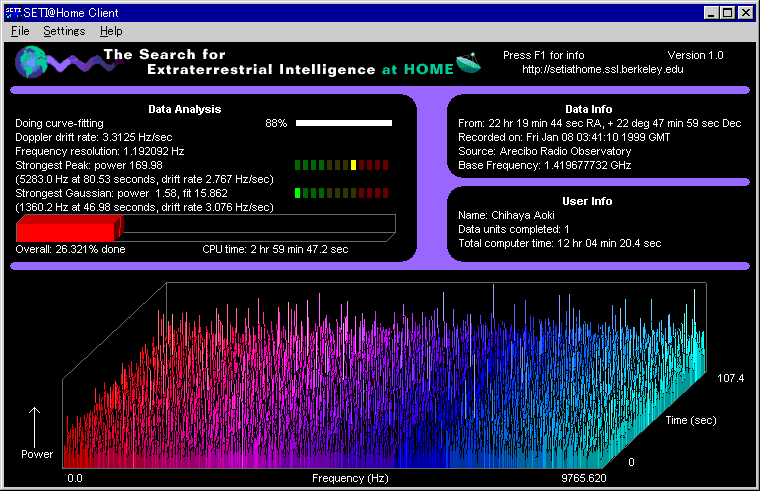 ![]() PowerPC系のクライアントと、Pentium系と両方やってみましたが、PPC系は全く歯が立たず。5倍くらい差がある感じ。RC5-64は逆にPPC系が有利なので、ここは上手く使いわけと云うことで、たまに450Mhz×2のデュアロンマシーンで解かせています。ユニット一つ解くのに12時間くらいですね。ちょうど一日2個というくらい。 で、こちらは何をやっているかというと、宇宙からの電波の中から知的生命体のメッセージが無いかどうか、色々見方を変えて眺めてみると言うソフト。宇宙人の存在を信じてる蒼騎にとっては、非常に興味深いプロジェクトだ。 あと、いつも電波が宇宙から飛んできてるような気がする人は確かめてみて。宇宙からのメッセージかも。 | |||