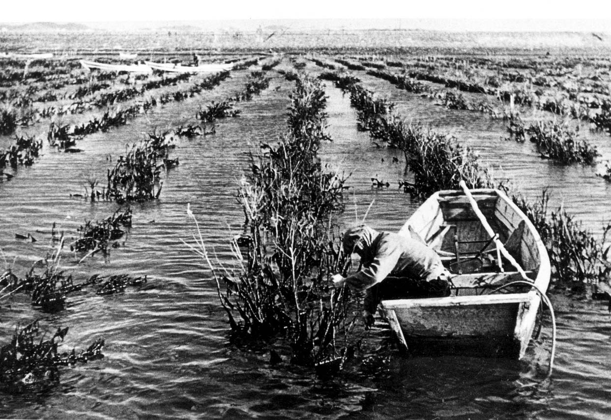 海苔は早ければ年の暮から採り始め、3月頃迄採取します船の上から、又は海の中を歩いて、粗朶に付いている海苔を摘み採ります写真1は昭和25年頃の三河湾六条潟の海苔摘み作業の風景ですこの作業の為、胸まで一体となったゴム長靴を着用し、場合によっては、高さ30cmから1m以上の鉄製のゲタを履いて、海の深い所まで入ります