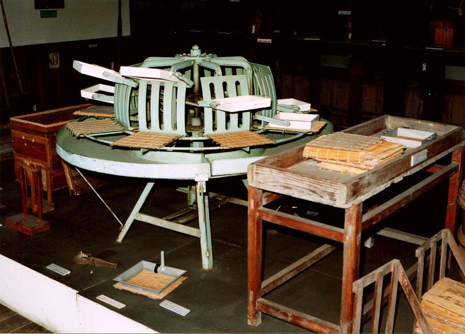 写真3は昭和30年代の手動の海苔抄き機で、自動化への過渡的な機械です昭和40年代から採取、海苔抄き乾燥に各種機械が導入されるようになり、機械化、自動化が進み、大量生産がされるようになりました