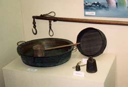 | 端反鍋(左)と水嚢(右)。 上と手前にあるのは、原料の受け入れに 用いた秤とそのおもり。 (撮影:石田正治) Kettle (left) and Sieve (right) |