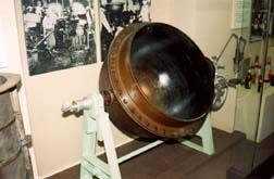 日本における近代的製造業としてのトマト加工業の技術進歩の過程を物語る資料として、回転式二重釜、自動裏漉機の一部が展示されています。端反鍋は、1921