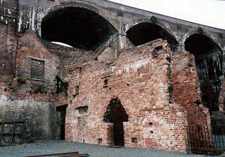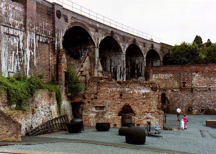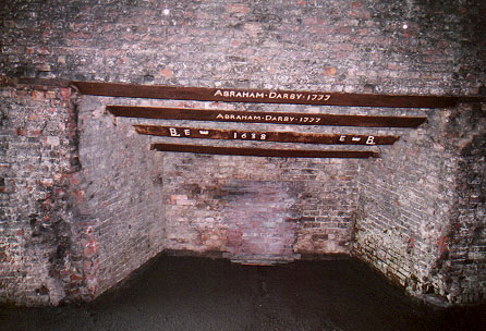 鉄の博物館の前には、製鉄所の遺構が残る。最も重要な遺産、タービーの最初のコークス高炉は、ピラミッド型のガラスで覆われて大切に保存されている。羽口(送風口)には、1638、1777の年号が鉄枠に書き残されている。1777年とは、ダービー三世がこの炉を増築した年である。2年後の79年、アイアンブリッジの鉄材はこの高炉で造られたのであった。
