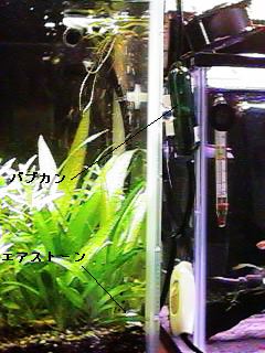みどボンによりエアストーンで添加(4滴/秒強制添加)(タイマーにて昼12時から夜9時まで添加,夜間はエアレーション実施)。掟破りの上部濾過があるので,CO2はどんどん発散してしまうが,それ以上にバンバンCO2を添加してる(^^;。みどボンなのでコストはかからないのでよしとしよう。アマゾンソードプラントをアリーナ水槽みたいに大株にしたいので,CO2拡散用のエアストーンはその根元に設置。CO2を添加するようになったら,アマゾンソードプラントの発育が良くなってきました。