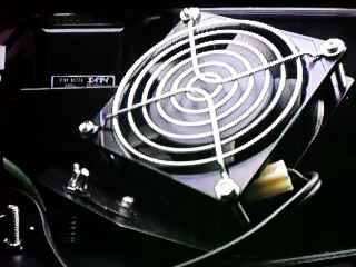 100V電動ファンにより,気化熱を利用した冷却を採用(^^;。気温35度のとき,水温28度を保ってます。これ以上温度が上がったら困るのでどうしようか思案中。水槽が設置してある玄関ホールに専用エアコンでもつけるか〜。
