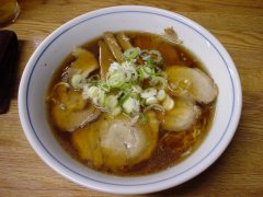 自分の職場のすぐ近く。週に1〜2回は行っています。タイプは高山ラーメン。カウンターには説明書きがあり,それには,だしは根菜 類,牛,豚,鶏,魚,…,からとったもので,しょうゆだれとだしを提供前にあわせるのではなく,あわせた状態で煮込み,しょうゆ臭さを消すようにしてスープを作るそうです。色合いは濃いめですが,とても澄んだスープです。野菜類の甘みが効いています。粗挽き黒胡椒が最初から入っています。最後まで飲み干せる体に優しい感じのするスープです。気のせいかもしれませんが,夜の方がスープにこくがあって美味しいような気がします。