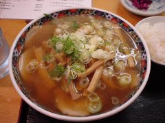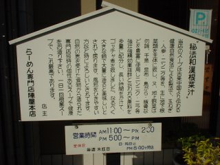 カウンター,小テーブル,大テーブル。ビールなし。入店時刻:AM12:10。スープはいわゆる好来系。注文したのは寿(チャーシュー,メンマ多し)+小ライス。全体的にボリューム感あり。スープは最初のインパクトはGOOD。第一印象ではバランスよく感じられたが,最後の方になってくるとスープのきつさが感じされ,全部は飲み干せなかった。麺は太めで若干ちじれで柔らかめ(シマダヤ製)。けれど味わい深い麺でした。チャーシューは脂身の部分が異常においしかった(^^)。が,乗っかっているチャーシューのそれぞれの味にばらつきがありました。おいしいのとかあまりおいしくないのとか…。メンマも味がよく染みておいしかったですが,もう少し弾力というか歯ごたえがあると良かったと思います。