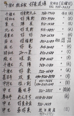 | 招福軒 | 名古屋市西区上名古屋3- 8-13 | 052-531-2189 | 2,7,12,16,20,26 日 | 10:00-15:00 | 05/12/30 |