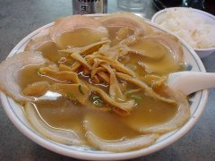 (2000.01.15)入店時刻11:45。焼き豚多しとライスを注文。好来系と聞いていましたが,好来とか好陽軒とかとくらべると,若干まろやかさが足りないかな〜,味がややきつい感じがしましたがおいしかったです。チャーシューは脂多めの私の好み系でしたがややうまみが抜けているような気がしました。メンマは普通な感じよりはややGOOD。免許書き換えの際はまた食べに行こうっと。