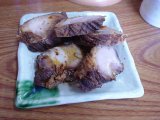 チャーシューメンとライスとビールを注文。すると店のおばちゃんが,ビールとつまみ用のチャーシューを持ってきてくれました。ビールにはサービスで分厚いチャーシューが5枚も付いてきました。んでもって「ほんとうにチャーシューメンでいい?」と聞いてくれたのですかさず「う〜,普通のラーメンの方にしてください」と返答(^^;。