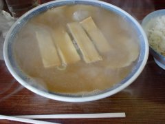 入店時刻11:30。スープは好来系。チャーシューは味にばらつきあり。頑固そうな爺さん?,親父さん?,奥さん?の3人で店を切り盛りしています。頑固そうな爺さんの息子さんである親父さんが例の店(好来)で修行されてたそうです。スープはこくがすごくある。かなりいけてるスープ。好来系のなかでは自分の好みとしてかなり上位にランク付けされます。麺も例によって太めのストレート若干縮れで柔らかめ。店は小汚く(^^;,カウンターのみでかなり狭いです。裏口からも出入りできます。駐車場は店の裏にあるんですが,3〜4台ほど止められると思います。