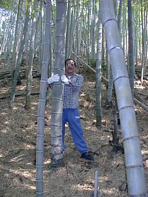 竹の選定中、3年以上の孟宗から選ぶ。 毎年この時期は、暑く、大量の薮蚊に悩まされ、また写真ではわかりにくいが、足場は悪く、斜面はきつい。年々年をとるに従って、登り下りがきつくなった。