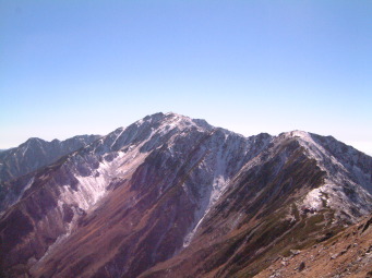 稜線では予想通り強い風が殴りつけてきた。冠雪もここから始まった。既に斜面の積雪は溶け出し感じの良いステップで歩きやすかった。 仙丈岳、甲斐駒、鳳凰三山もはっきり見え。八が岳、富士山、中ア、御嶽、遠くは北アの槍の穂まではっきりと見えた。 小太郎尾根に出たときには時間内に山頂に着けるかどうか不安だったけど、思ったより早く到達できた。 山頂だけは風もなく陽光の下3パーティだけの静かな会食タイム。 |