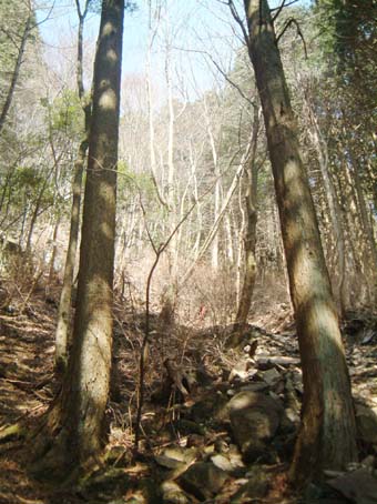 やっと春らしい暖かい高気圧に覆われた好日。朝9時30分に出たけど時間的に明神山あたりにしか行けそうにない。また大峠や白鳥山ではもの足りない気がした。 ここの急登に比べれば鬼岩乗越から六合目に登る途中の胸突八丁は子供の滑り台のような物。上方に馬の背岩辺りを見上げながらゆっくり休まず歩を繰り返し思ったより早く中道からのコースに出会ってしまった、ちょっとがっかり。更に急登を少し繰り返すと山頂からの鞍部に出る。 |