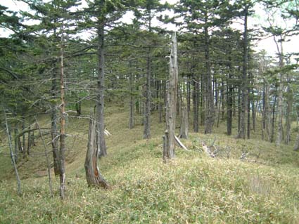 登りに漕いだ笹原を快適に漕ぎ下る。足元に時々倒木があってコケそうになるが気持ちのいい一人旅。完全にクライマーハイ状態だった。鹿から見ると一人ではしゃいで気色悪い人間だったことだろう。 彼らも楽しんで既に引返したようで静かな午後。 |