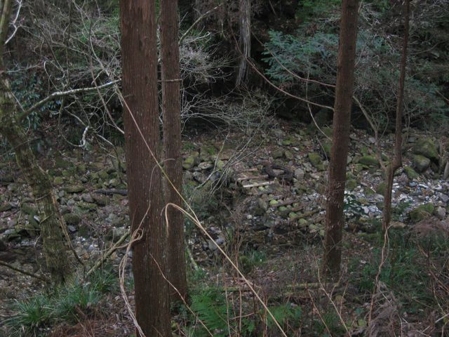下山は、先の700mから左の方の派生尾根を赤い境界棒に従ってっ下る。600m辺りの岩場のとこで左にテープがあったけど、そのまま岩を越え尾根を下る。境界棒はここからは現れなかった。踏み跡に従って徐々に高度を下げ、川音が聞こえ出す450m辺りから段々踏み跡の幅が狭くなり、枯れ枝、イバラがからみあって顔の前を塞ぎ出す。最後堰堤が見える頃には、格闘する羽目になった。ここから登ると最初の100mが相当キツイアルバイトになる。