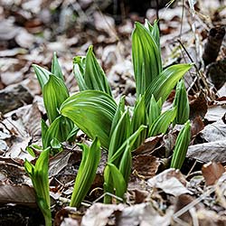 湿原周辺の沢沿いでは、バイケイソウの発芽が進み現在は大きいものは高さ20cm弱になっています。 一方、ミカワバイケイソウの発芽は、これからです。 バイケイソウの花期は5月下旬頃から、そしてミカワバイケイソウは4月下旬頃であり、花期の早いミカワバイケイソウの方が発芽が遅く、一気に咲いて短期間に結実するという生活スタイルは高山植物の血筋を感じさせます。 |