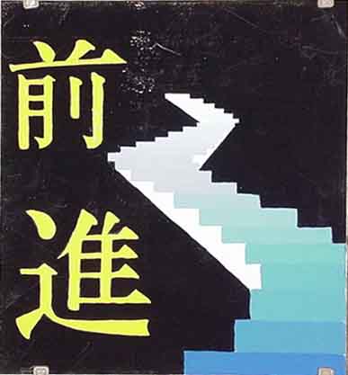 1−6 山本彩香 「前進」 勉強でも部活でも、少しずつでいいから前進していきたいという意味です。『立ち止まらない』という意味もこめて階段が続いている絵を書きました。 |
