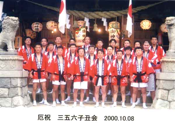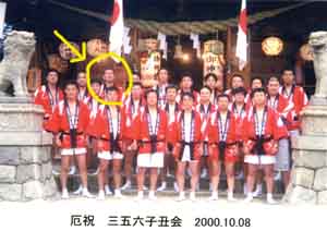 The man in a yellow circle is ME. We wear happi coat. We wear white short pants, sarashi or a roll of white clothes sorounded on our body, and tabi or soft shoes like socks. We are standing in fron to fhe shrine. We stands behind a pair of komainu or dogs at the gate of a Shinto shrine. |