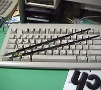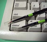筆です。私の使っている筆は、ナイロン製の筆です。良く見るとオレンジ色をした独特の腰をもった筆です。後、異様にながい筆で、30センチほどの長さがあります。しかしながら肝心の筆の部分は1センチにも満たないものです。フナ釣りのウキみたいに、長い柄のお尻の微妙な動きを見てとることができるので、細かい作業がしやすいです。
