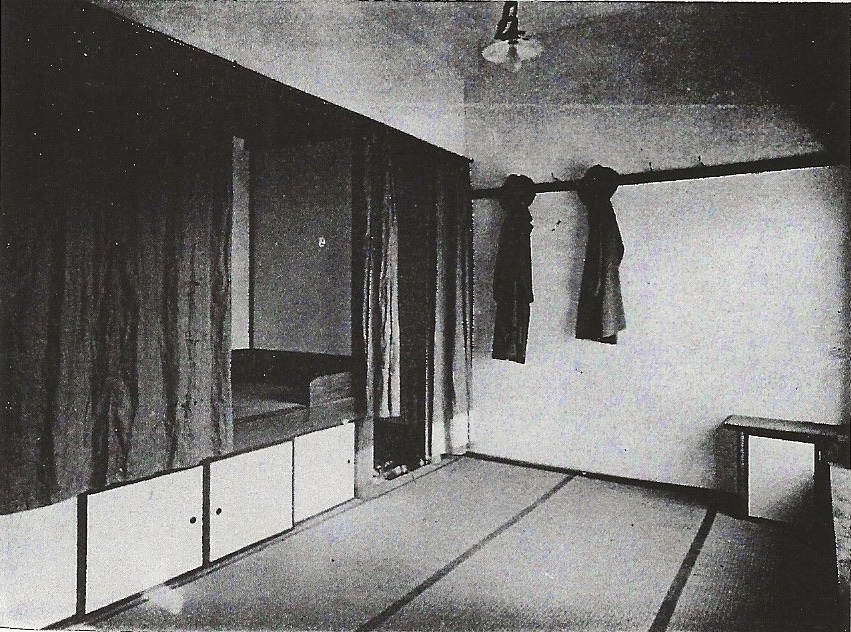 同潤会には明治以来「田園都市」など、都市政策に詳しい人もいたでしょうから、「洋式住宅」の機能別部屋作りの無駄の多さを充分に研究していたでしょう。住む人は一度に2つ以上のことをするわけではないので、 籐椅子ぐらいは置けますよ、というわけで、主人が客と対面している場面です。