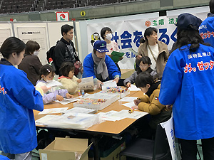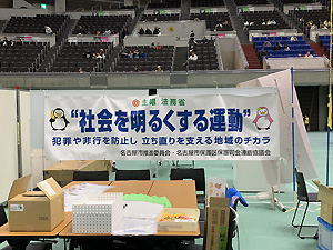 | 2026年(令和8年)2月1日(日曜日)午前10時から午後3時まで南区 区民まつりが日本ガイシスポーツプラザにおいて開催されました。 今年度の区民まつりはガイシホールがアジア大会へ向け改修工事が行われていたことから、2月の開催となりました。 保護司会は、背中に赤字で薬物乱用は「ダメ。ゼッタイ」と書かれた青色のハッピを着用し、保護司活動のPRと薬物乱用防止をテーマに区民まつりに参加しました。 薬物乱用防止クイズはパネルを見て答えていただくもので、参加者へホゴちゃんせんべい、保護司会広報紙などをお渡ししました。クイズ参加者には”みかんの目方あて”に挑戦していただきました。 ホゴちゃんお絵かきコーナーにはたくさんの子どもたちが参加し、楽しそうにお絵かきをしていました。子どもたちへは色鉛筆、ホゴちゃんクリアファイルをプレゼントしました。 保護司会ブースへは更生保護女性会や名古屋南地区BBS会5名のご協力をいただき大盛況のうちに終えることができました。 |