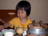 左記写真が、夕食の様子ですが、メニューはきんめだいの煮付け、茶碗蒸し、タコ飯、タイしゃぶ、天ぷら、お吸い物、刺身、デザートに杏仁豆腐などです。小さいお子様がいる方は、できればお子様用のメニューを追加した方が良いかもしれませんが、我が家ではいつも取り分けにしています。