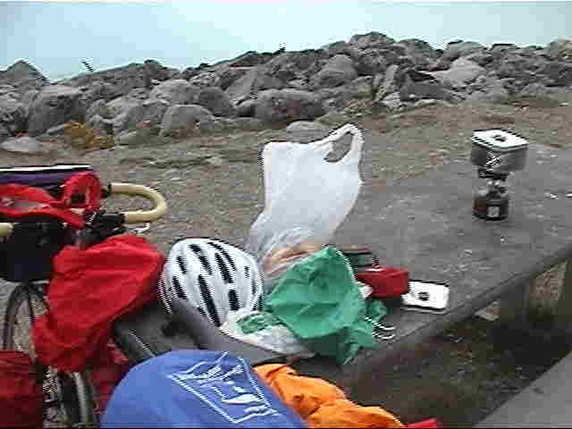 ダムの休憩所に着く(12:00)。ピクニックテーブルで昼食の準備をする。今日は