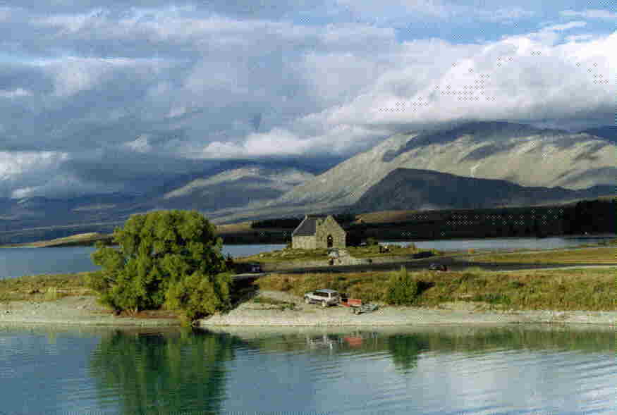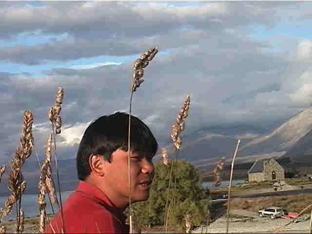 (人前にさらしたくない、私のアップ Tekapoのメインの観光名所「良き羊飼いの教会」だったかな?)