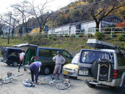 車を河川敷の駐車場にデポし出発の準備、ここで市川さんのランドナーのRメカの調子が悪