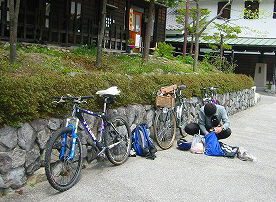 いきなり青空が覗きだす、11時大町温泉郷に到着。早速自転車を組立、昼食をとり出発の