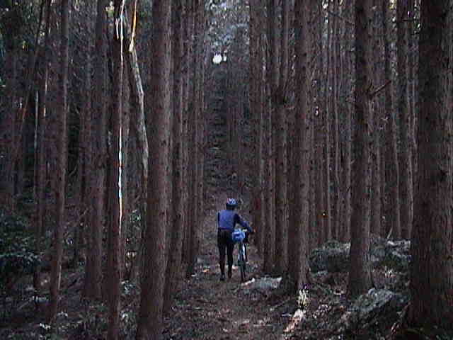定変更。ハイキング道を1.2km押したり担いだりしながら標高を稼ぐ。途中わずかだが乗れ