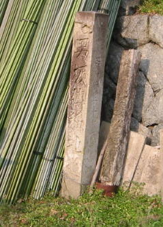 男坂の最後の取り付きは民家横の田んぼの是道のような所に入る。石の道しるべが無けれ
