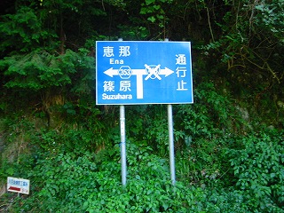 (二俣にて、右折国道が「通行止め」の看板 ここからは自己責任がつよくなる)