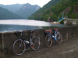 (市川氏のカーボンバイクに小生のクロモリバイク) (宇蓮ダムの説明板)