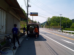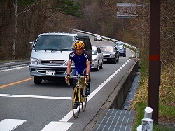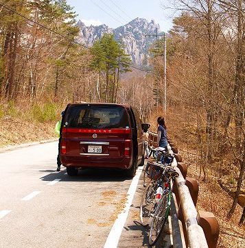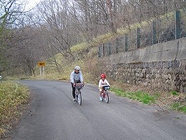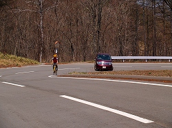 峠に向かっていよいよ上りが始まるところで、娘は一端「車中の人」となり大人4人で