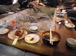 囲炉裏端にどっかり座り込み、定番の「山菜うどん・五平もち・味噌田楽(900円也)」を