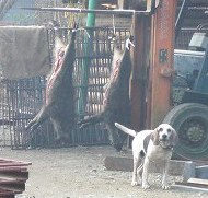 猪を狩猟している家の前を通ります。今回も2頭ほどの猪が吊るされてました。