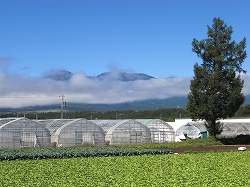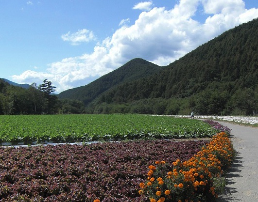 (直線道路脇は高原野菜のキャベツ畑がつらなります)