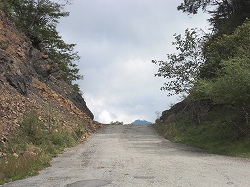 (信州峠への直線道路、はるか先に先発隊が確認できる)