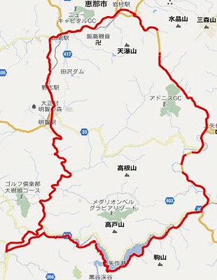 小渡→矢作第2ダム→木の実峠→岩村→明智→小渡 約60km