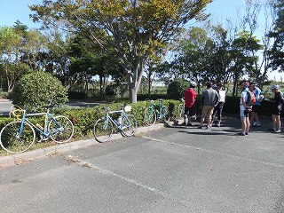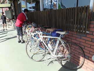 道路が通行止め。ヒルクライムを楽しみにしていた(?)皆さんは、しかたなく喫茶店で大休止。