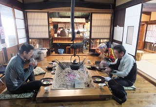 (囲炉裏端での食事がいいんだな〜)