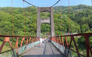 から県道に入ります。県道分岐手前にかかる板張りのつり橋(車:通行止め)を渡り対岸に行きます。