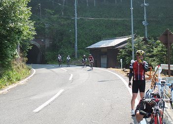 ます。旧道トンネルへの小峠もみなさん良いペースで走られ、トンネルを抜けて琵琶湖の展望のきく所で小休止。