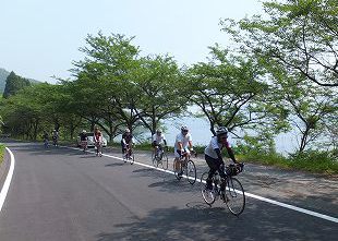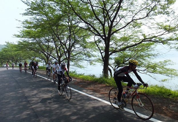 (琵琶湖北部のこのコースは桜並木とともに交通量も少なく気持ちよく走れる区間)
