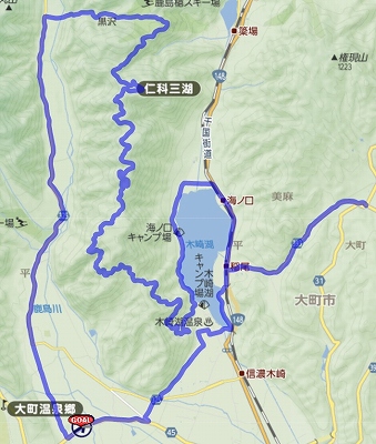 大町温泉→木崎湖→美麻→木崎湖→小熊黒沢林道→鹿島→大町温泉 約45km