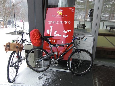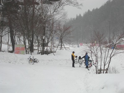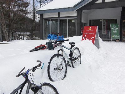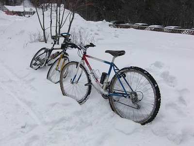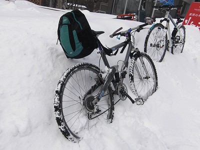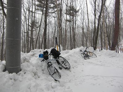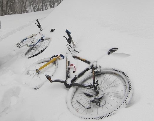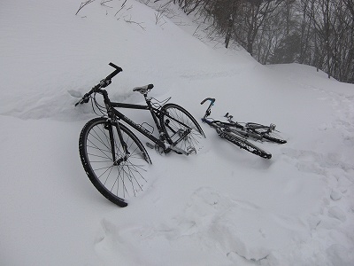 (除雪区間を過ぎると膝ぐらいまである積雪、乗っていくこともできず、自転車はただの荷物)