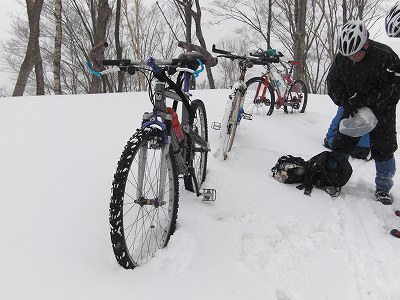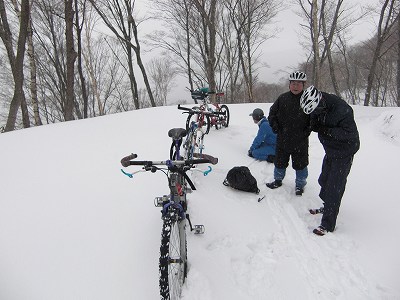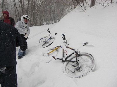 自転車は押していくことになります。圧雪してないので先頭を行く人が踏み跡をつけますが、時折膝まで埋まる行軍で