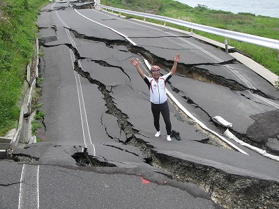 道の駅から4人で走り出す。しばらく国道9号線を走り、太田の手前で海岸線沿いの県道に入ります。途中、路面崩壊で