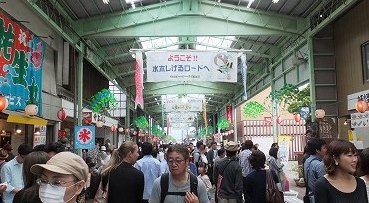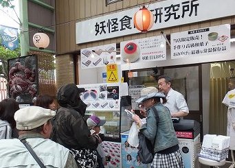 (鬼太郎の作者、「水木しげるロード」は観光客でいっぱい) (目玉おやじの饅頭が土産物で売られていました)